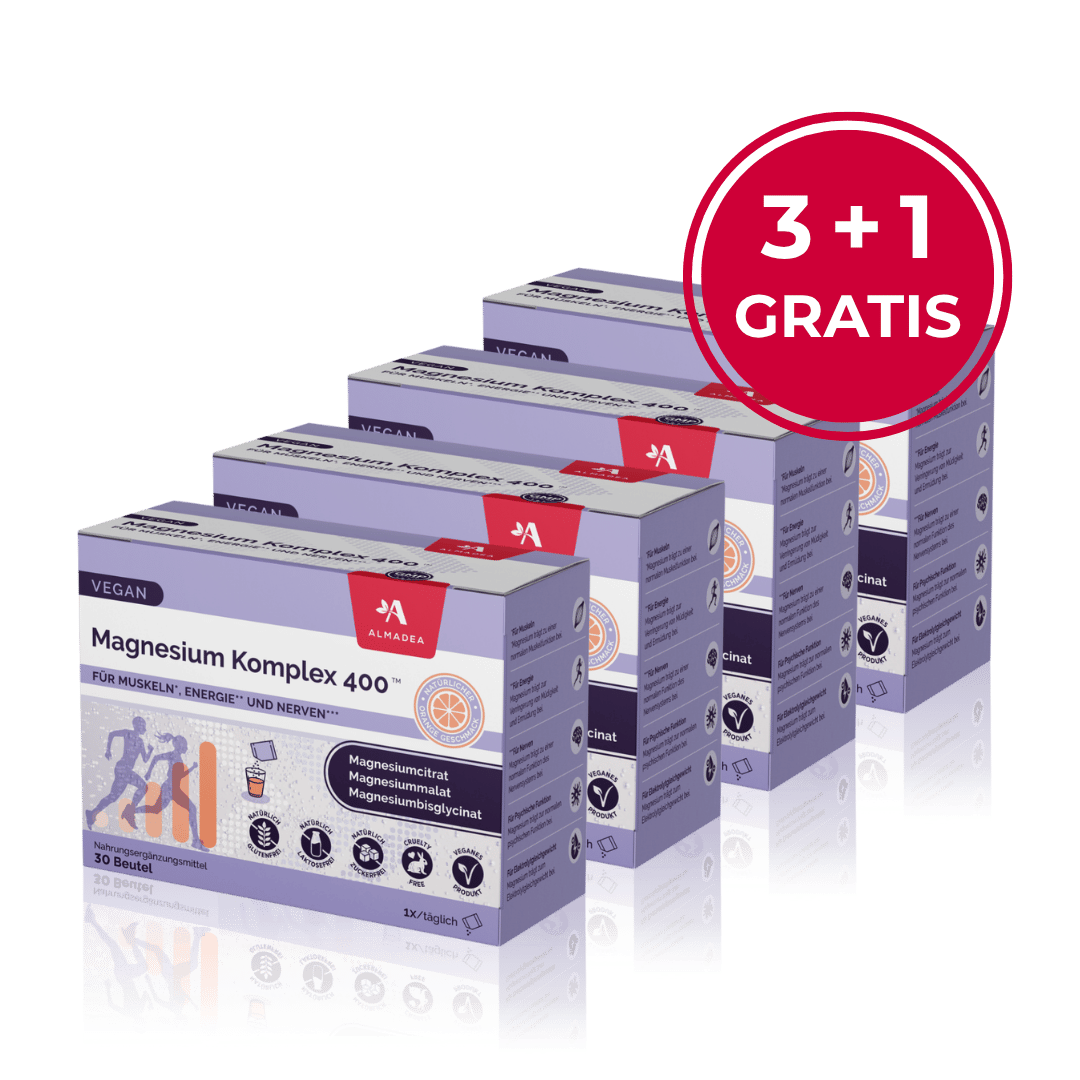 Magnesium Komplex 400 aus dem Almadea-Sortiment kann über einen längeren Zeitraum eingenommen werden – mehrere Monate oder auch regelmäßig das ganze Jahr über. Es handelt sich um ein Nahrungsergänzungsmittel mit natürlichen Magnesiumformen (Bisglycinat, Malat, Citrat), die für eine langfristige Anwendung geeignet sind. Es sind also keine Pausen erforderlich – es sei denn, Ihr Arzt empfiehlt etwas anderes.